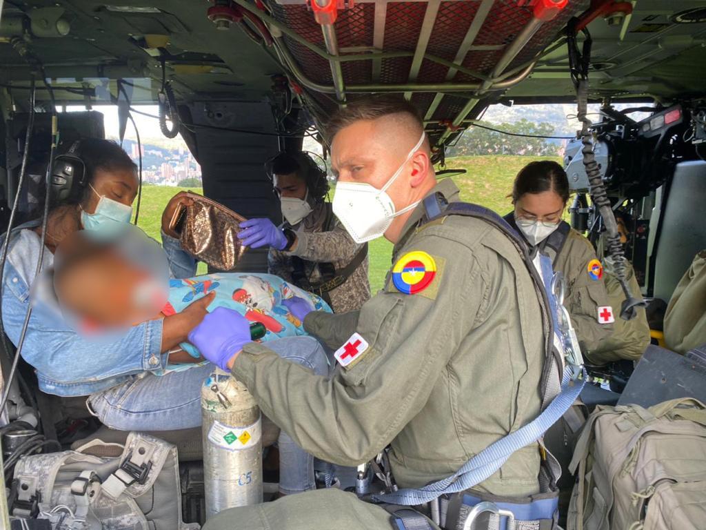 Un niño de tres años edad, debido a su delicado estado de salud por afecciones respiratorias fue trasladado en un helicóptero UH-60 ‘Ángel’ de su Fuerza Aérea Colombiana desde Quibdó hacia Medellín.