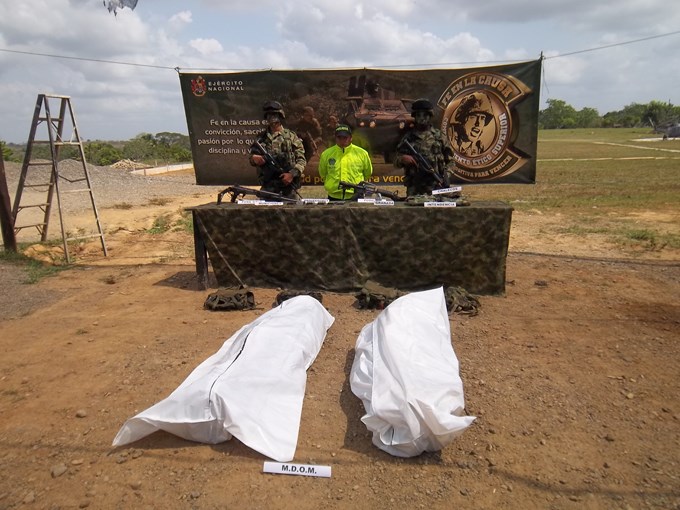 Estos dos sujetos de género masculino no han podido ser plenamente identificados, vestían prendas de uso privativo de las Fuerzas militares y se les incauto 1 fusil Colt M-4 calibre 5,56 mm, 1 fusil GALIL 5.56 mm, 1 granada de mano IM 26, 5 proveedores para fusil COLT M-4, 1 proveedor para fusil GALIL, 209 cartuchos 5.56 mm, 1 chaleco multipropósito, 4 morrales y documentación importante para la inteligencia militar.