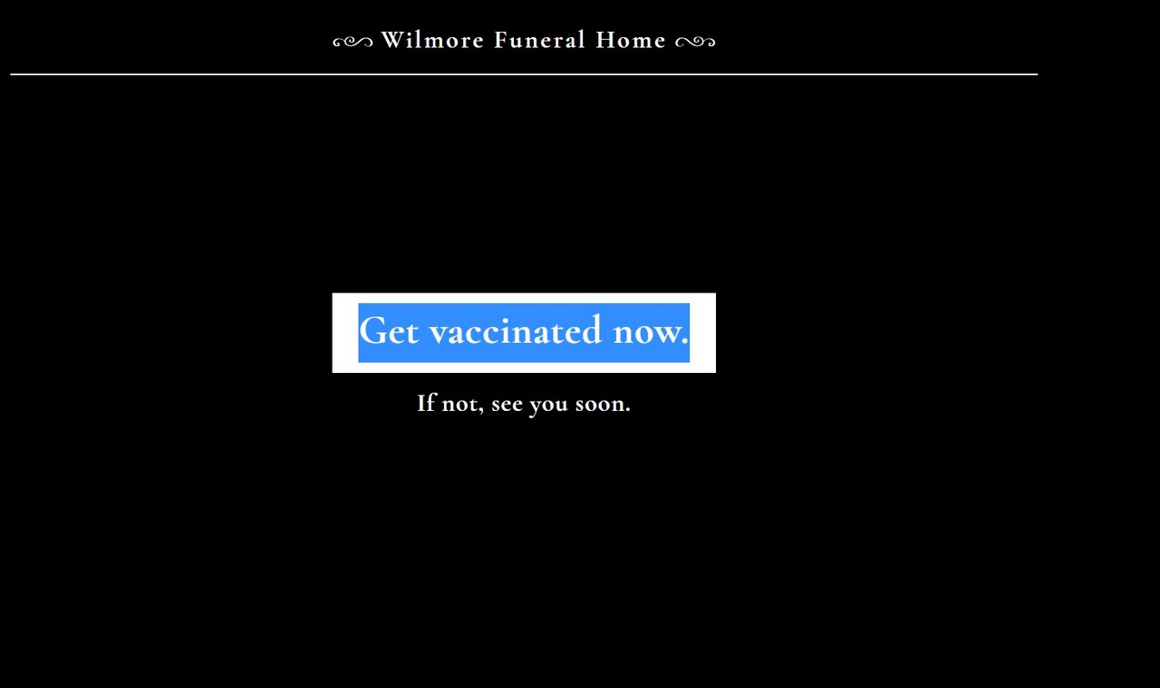 Al ingresar a la página web de la supuesta “Funeraria Wilmore” se lee todo lo contrario de lo que dice en el camión, “Vacúnate ahora” y de manera contundente aseguran que los que no se vacunan tiene más probabilidad de complicaciones que podrían llevar a la muerte, “Si no, nos vemos pronto”.