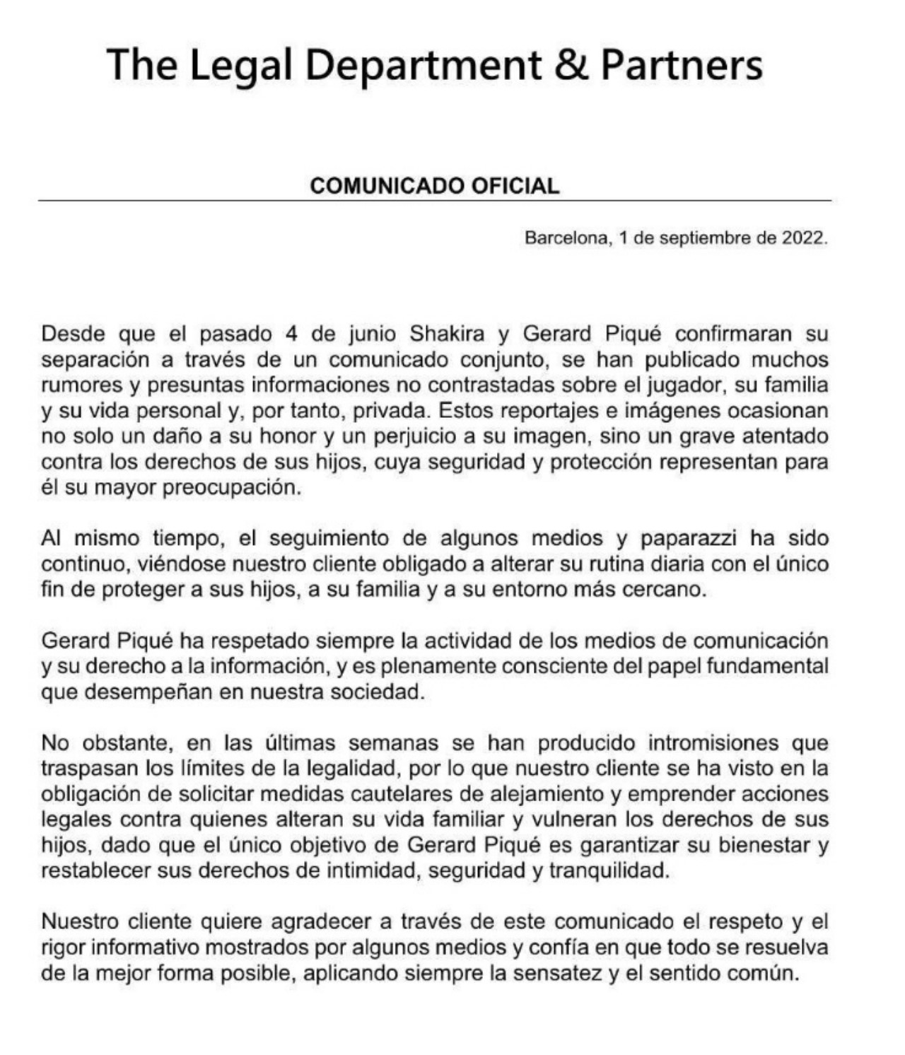 “Desde que el pasado 4 de junio Shakira y Gerard Piqué confirmaran su separación a través de un comunicado conjunto, se han publicado muchos rumores y presuntas informaciones no contrastadas sobre el jugador, su familia y su vida personal y, por tanto, privada. Estos reportajes e imágenes ocasionan no solo un daño a su honor y un perjuicio a su imagen, sino un grave atentado contra los derechos de sus hijos, cuya seguridad y protección representan para él su mayor preocupación”, dice al inicio de la misiva.