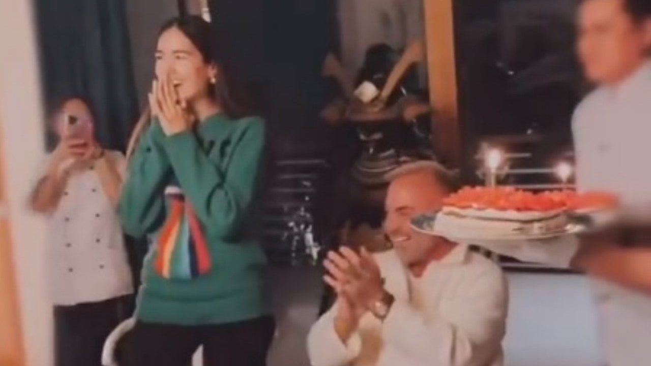 En las historias compartidas en redes sociales dejaron ver como él entró a su habitación con un pastel de cumpleaños y un gran ramo de rosas blancas con una rosa roja al centro.