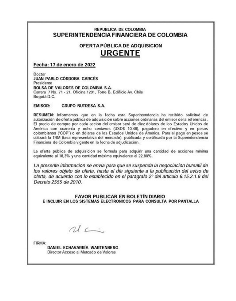 Minuto30.com .- El Grupo Gilinski lanza una nueva OPA por Nutresa en la noche de este lunes 17 de enero. Así lo hizo saber la Superintendencia Financiera que, además, ordenó la suspensión de la negociación de la acciones de la empresa de alimentos.