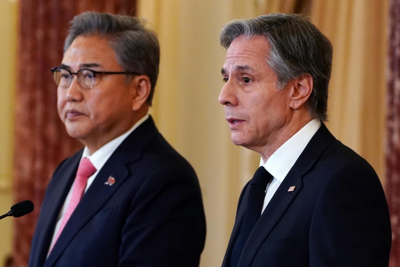 El ministro de Exteriores de Corea del Sur, Park Jin (i), junto al secretario de Estado de Estados Unidos, Antony Blinken (d), durante una conferencia de prensa en el Departamento de Estado, en Washington, este 3 de febrero de 2023. EFE/EPA/Will Oliver