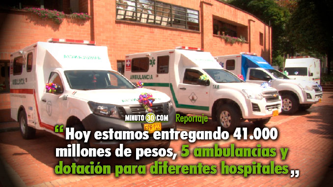 Destacó el funcionario, que con la entrega el día de hoy de las cinco ambulancias para los municipios de Amagá, Cañasgordas, Guadalupe, Montebello y Sabanalarga, se ajustan 35 ambulancias durante este periodo y que la meta es llegar a 100 y también anunció la entrega de dotacion por mas de cinco mil millones de pesos para 35 hospitales del departamento.