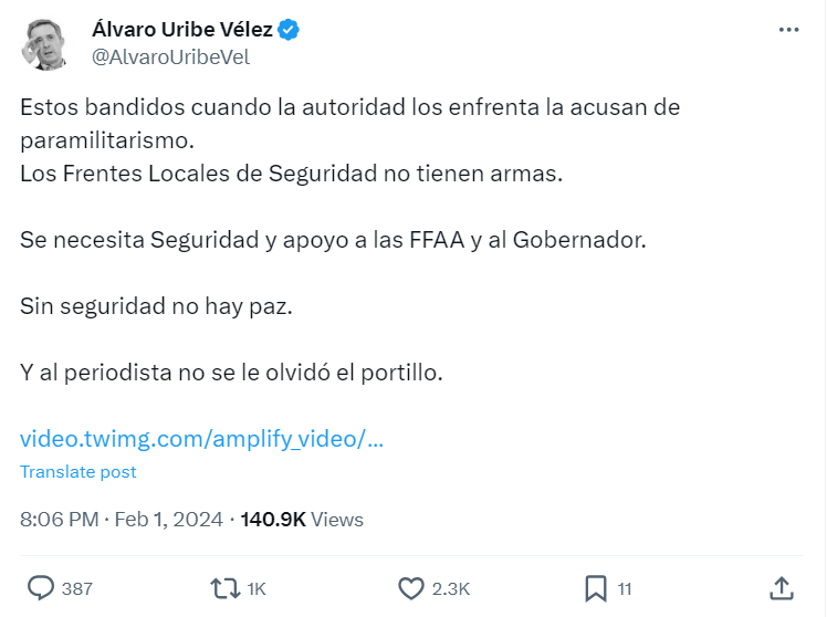 “Estos bandidos cuando la autoridad los enfrenta la acusan de paramilitarismo. Los frentes locales de seguridad no tienen armas. Se necesita más seguridad y apoyo de las FFAA y al gobernador. Sin seguridad no hay paz. Y al periodista no se le olvidó el portillo”.