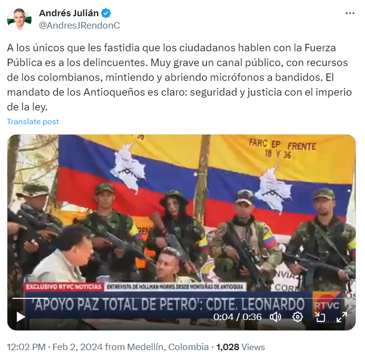 Esto provocó la reacción del mandatario de los antioqueños, quien al compartir el fragmento del video, escribió en X: “A los únicos que les fastidia que los ciudadanos hablen con la Fuerza Pública es a los delincuentes. Muy grave un canal público, con recursos de los colombianos, mintiendo y abriendo micrófonos a bandidos. El mandato de los Antioqueños es claro: seguridad y justicia con el imperio de la ley”.