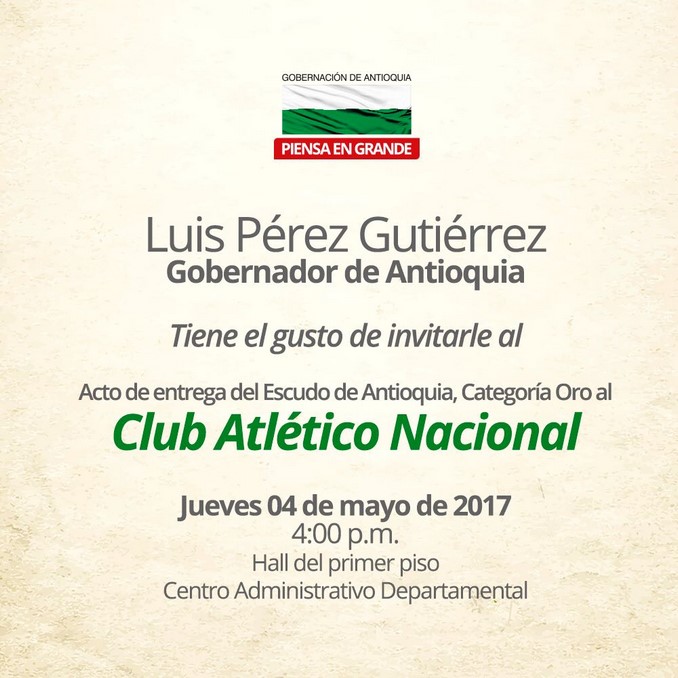 El gobernador de Antioquia, Luis Pérez Gutiérrez, anunció en las últimas horas que le hará un reconocimiento a Atlético Nacional con motivo de la conmemoración de sus 70 años.