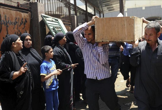 Varios hombres portan un ataud que contiene los restos de un simpatizante de los Hermanos Musulmanes que murió durante un intento de fuga, en una morgue en El Cairo (Egipto). EFE