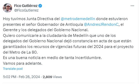 “Quiero comunicarle a la ciudadanía de Medellín que uno de los delegados del Gobierno Nacional dejó constancia en acta de que están garantizados los recursos de vigencias futuras del 2024 para el proyecto del Metro de La 80”, escribió el mandatario en su cuenta de X.
