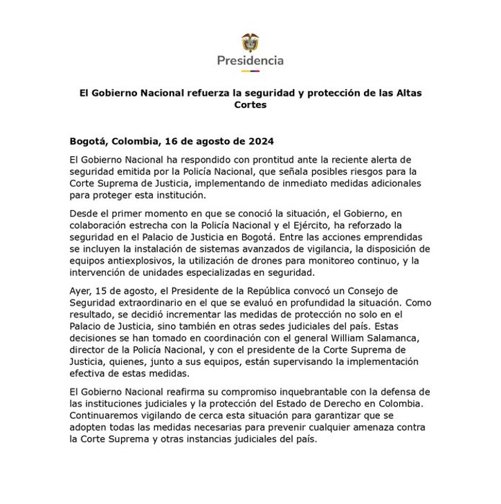 Además, la Casa de Nariño informó que seguirán analizando la situación para asegurar que se adopten las medidas necesarias para prevenir futuras amenazas contra las instituciones judiciales del país.