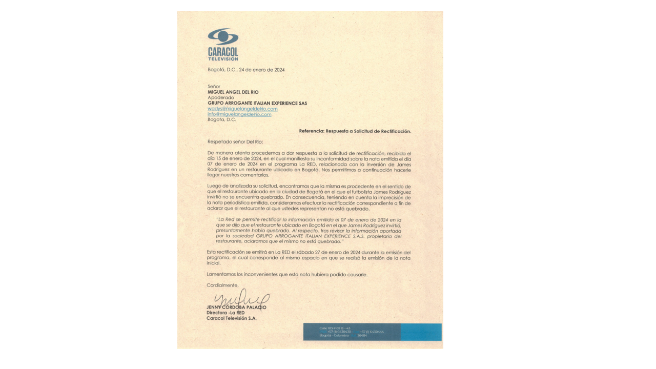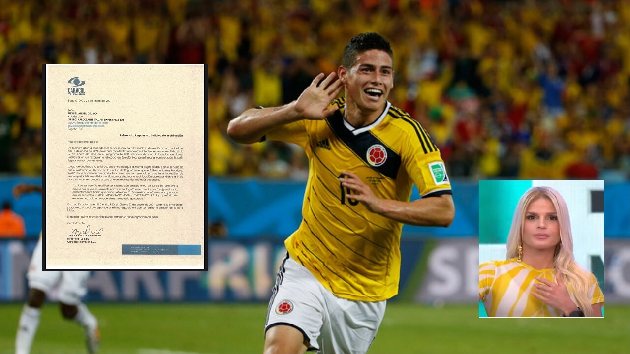 Luego de esto Mary Méndez quiso aportar con un comentario. “Acuérdense que James, al parecer, me contaron, se rumora, se dice y se especula, que quebró con su restaurante acá en Bogotá. Así que mejor que invierta mejor su platica”. Dijo la presentadora al referirse al “Restaurante Arrogante” del que el futbolista es socio. Fue el abogado y representante legal de la sociedad Miguel Ángel del Río, que le pidió a ella una rectificación desde sus redes sociales. Precisamente este miércoles 24 de enero, se conoció que Jenny Córdoba Palacio, directora de la Red en carta con membrete del Canal Caracol; reconoce que hubo un error y ligereza por lo que procederán a una rectificación de lo dicho por Méndez este sábado 27 de enero. “Tras revisión aportada por la sociedad GRUPO ARROGANTE ITALIAN EXPERIENCE SAS propietaria del restaurante, aclaramos que el mismo no está quebrado“. En la misiva que compartió el abogado también se lee que la directora en nombre del Canal Caracol: “lamenta los inconvenientes que esta nota hubiera podido causarle”.
