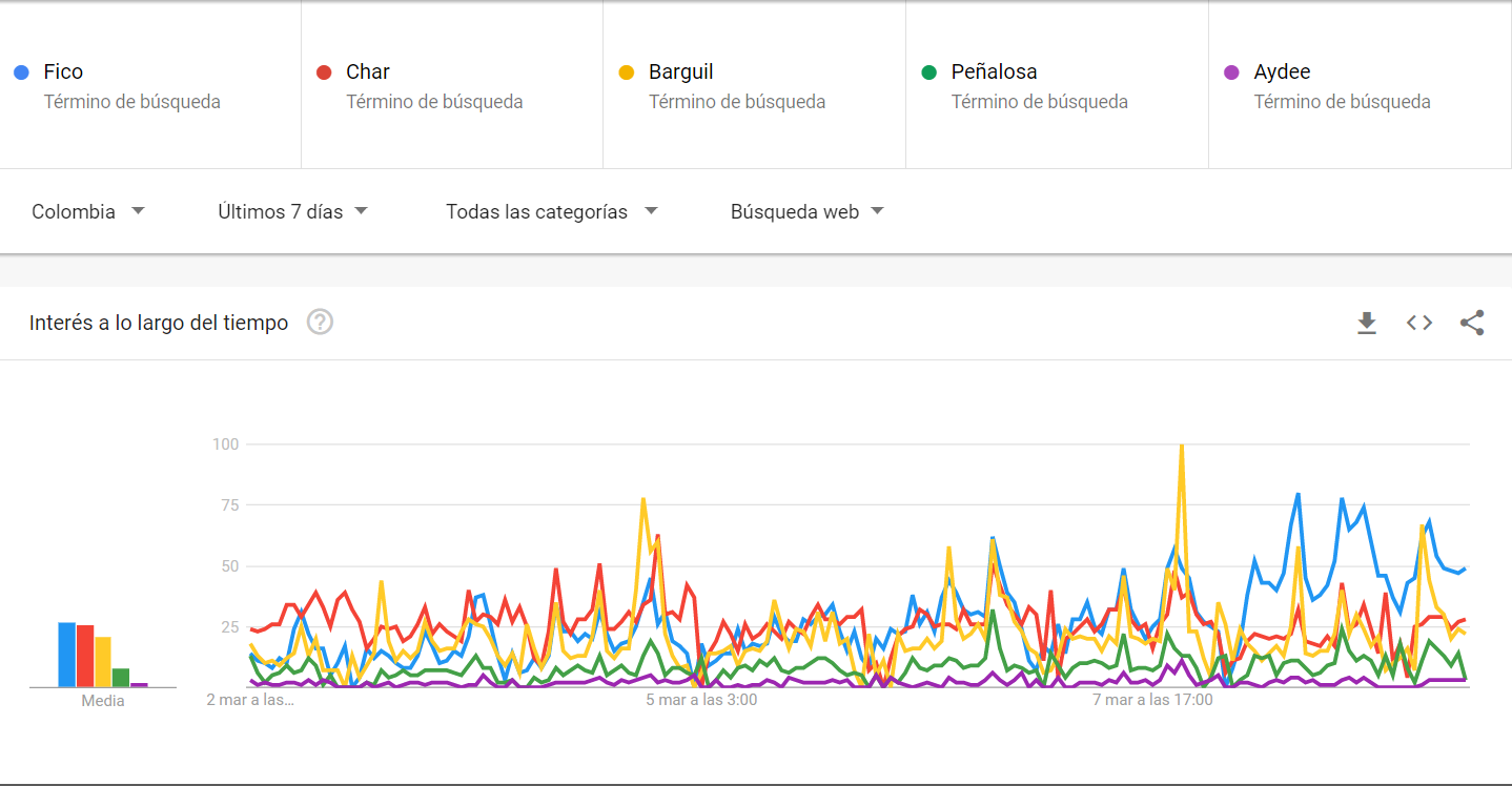 Buscando en las métricas a los candidatos Federico Gutiérrez (Fico), Álex Char, David Barguil, Enrique Peñalosa y Aydee Lizarazo, se puede apreciar que las dos personas que lideran en búsqueda son el primero y el tercero.
