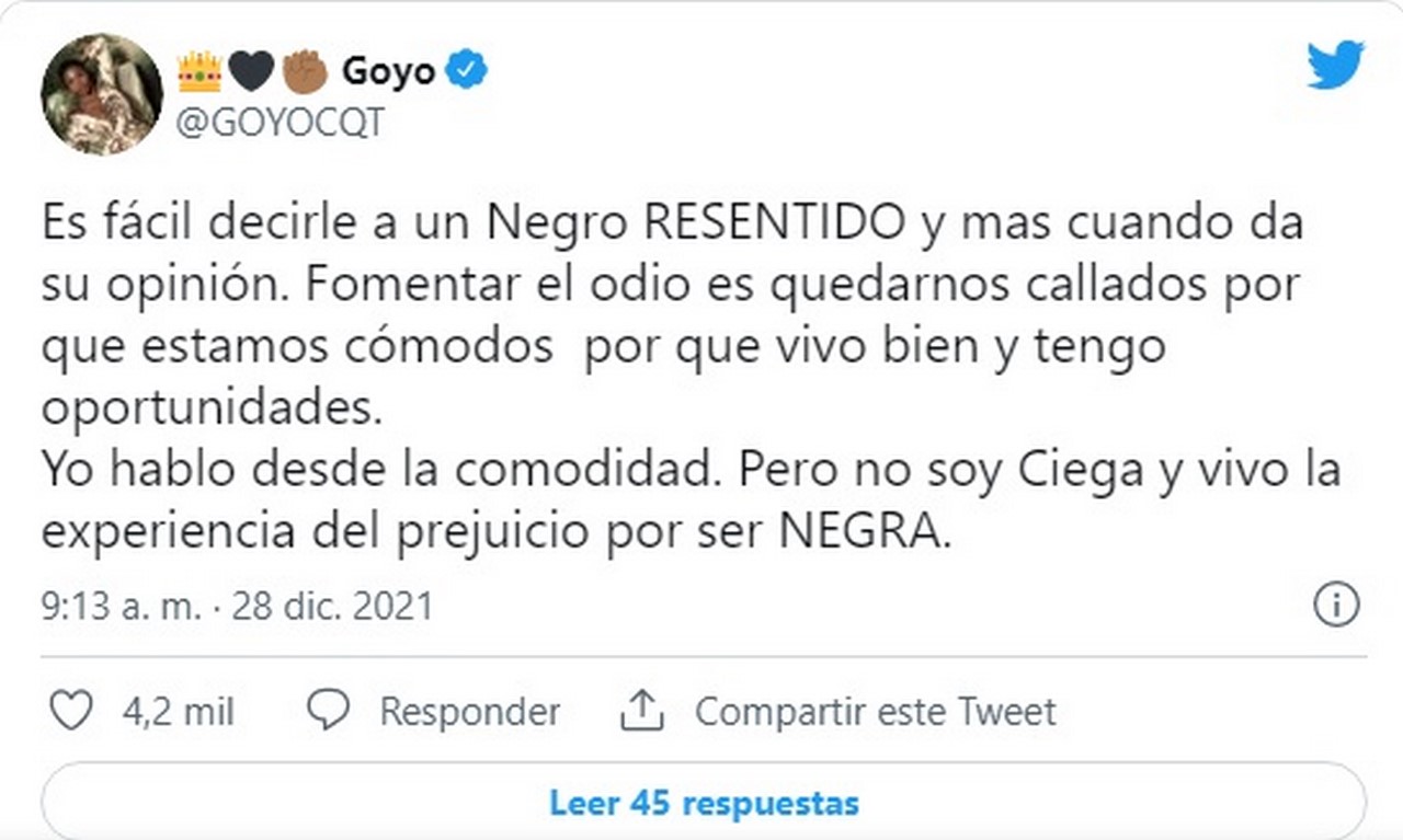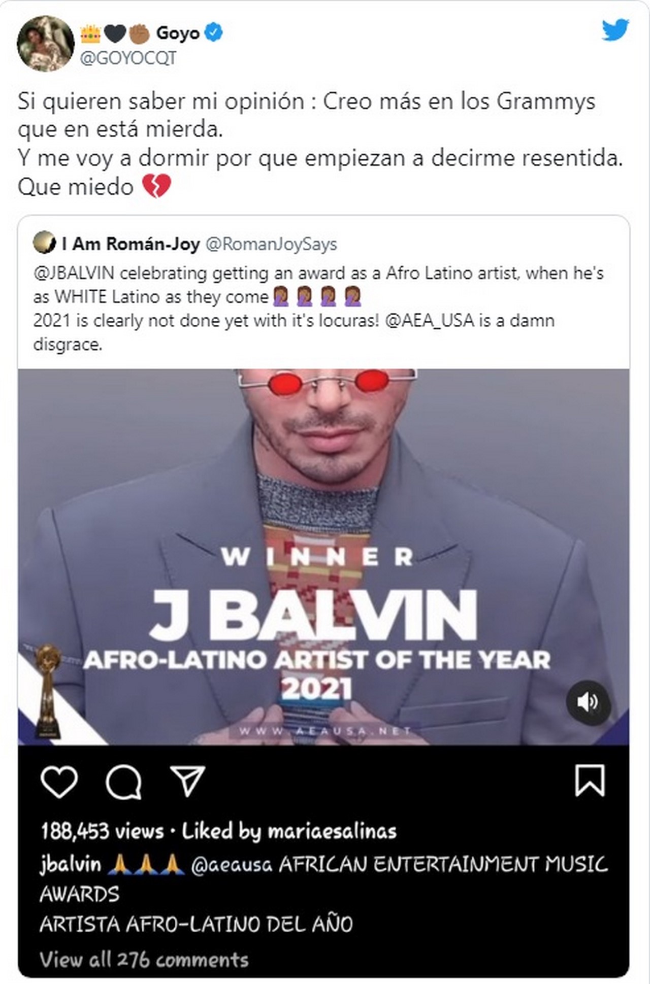 En la mañana de este martes 28 de diciembre, “Es fácil decirle a un Negro RESENTIDO y mas cuando da su opinión. Fomentar el odio es quedarnos callados por que estamos cómodos por que vivo bien y tengo oportunidades. Yo hablo desde la comodidad. Pero no soy Ciega y vivo la experiencia del prejuicio por ser NEGRA”, y es que el premio otorgado a J Balvin a generado memes y todo tipo de comentarios en redes sociales.