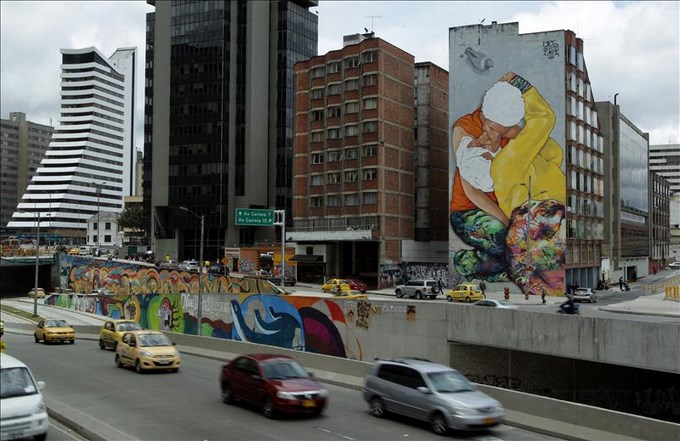 Fotografía tomada el pasado 10 de septiembre en la que se registró un graffiti de 10 pisos de altura en el centro de Bogotá (Colombia). COLOMBIA.INN