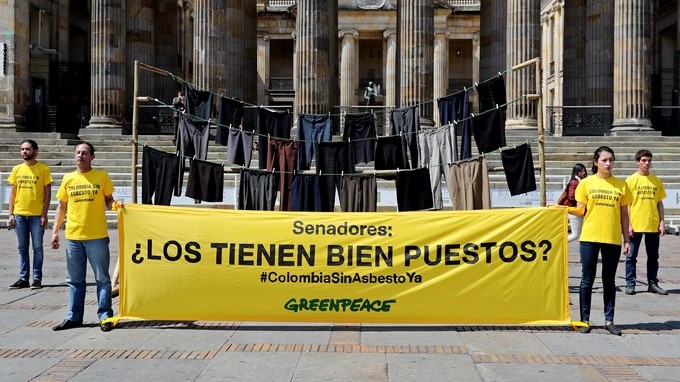 La organización ambiental Greenpeace se manifestó frente al Congreso colombiano para pedirle a los parlamentarios que aprueben la ley “Ana Cecilia Niño”, con la que se pretende prohibir el uso del asbesto en el país. “Senadores ¿Los tienen bien puestos?. #ColombiaSinAsbestoYa”, reza una pancarta de los ambientalistas frente a un tendedero con pantalones y faldas, […]