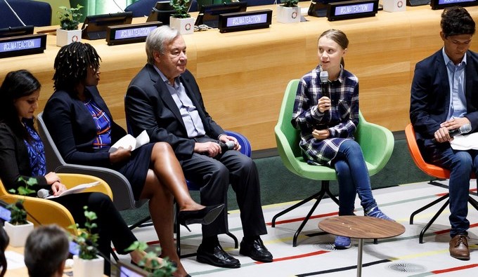 La activista sueca Greta Thunberg, inspiradora del movimiento juvenil contra el cambio climático, y otros tres jóvenes activistas denunciaron este sábado en la ONU junto al secretario general, António Guterres, la inacción ante el cambio climático y pidieron un mundo sin emisiones contaminantes.