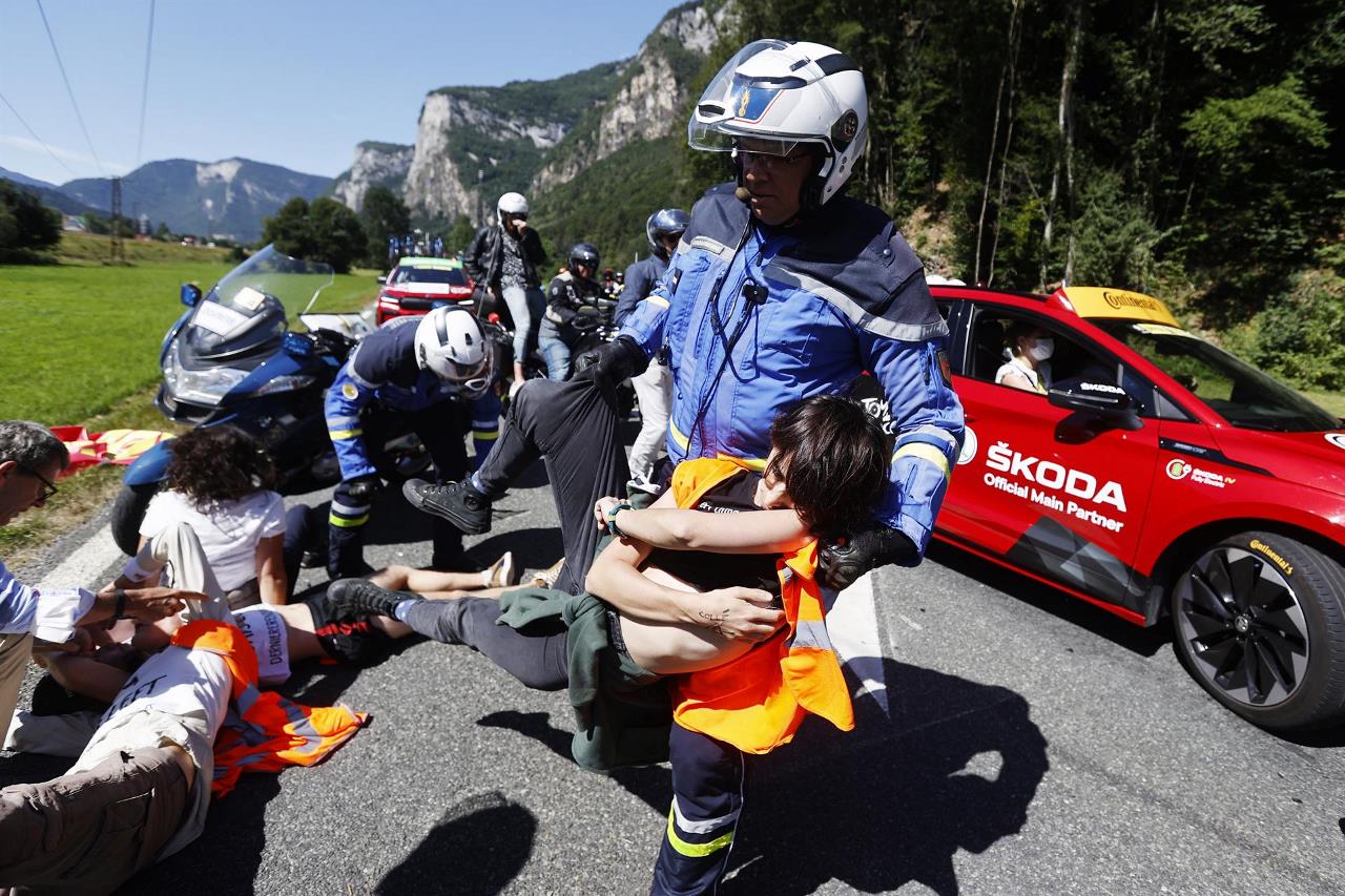 “Nueve ciudadanos y ciudadanas que apoyan a Dernière Rénovation han interrumpido la décima etapa del Tour entre Morzine y Megève a la altura de Magland. No podemos seguir siendo meros espectadores del desastre climático que acontece”, indicó el grupo en Twitter.