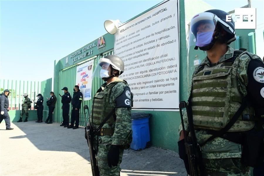 Este sábado, los cuerpos de seguridad custodian los accesos en el hospital de Ecatepec, un municipio del Estado de México, en el cual se han registrado un total de 407 casos confirmados y 28 defunciones desde el inicio de la pandemia a finales de febrero.