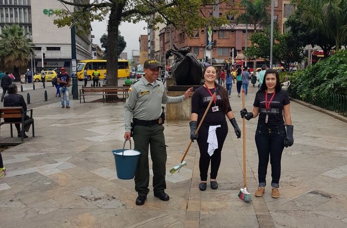 El grupo realizó ornato y embellecimiento de los monumentos ubicados en la plaza Botero. Con el fin de que los ciudadanos se vinculen al cuidado y mantenimiento de parques y atractivos turísticos realizaron la actividad.