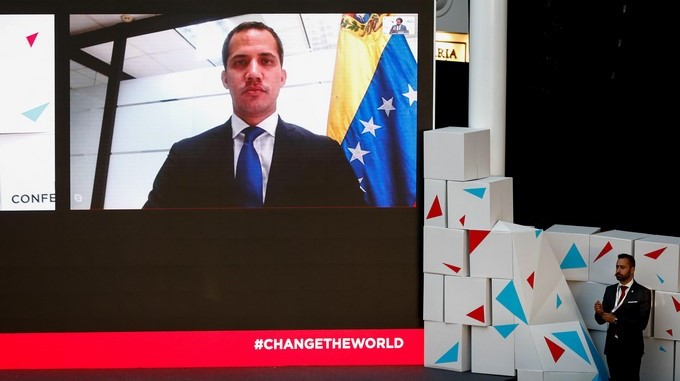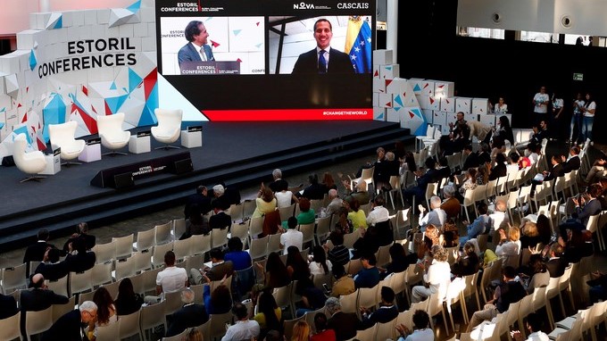El presidente de la Asamblea Nacional de Venezuela Juan Guaidó habla vía video este lunes, durante el panel “Cambios globales, respuestas locales” de la Conferencia Estoril 2019, en Cascais (Portugal). EFE
