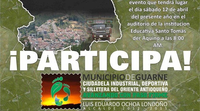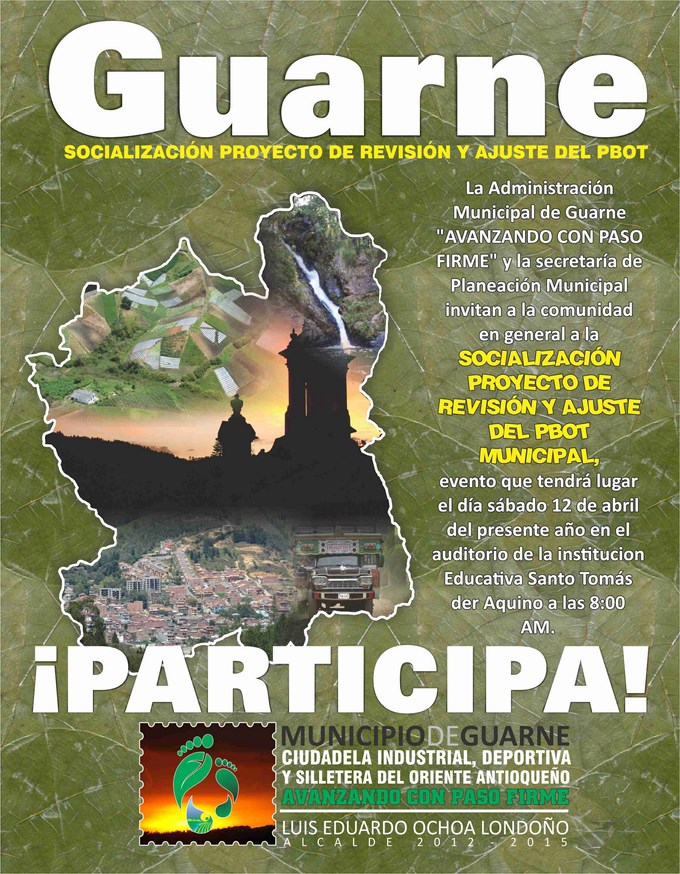 La Administración Municipal de Guarne y la secretaría de Planeación Municipal invitan a la comunidad en general a la socialización proyecto de revisión y ajuste del PBOT municipal