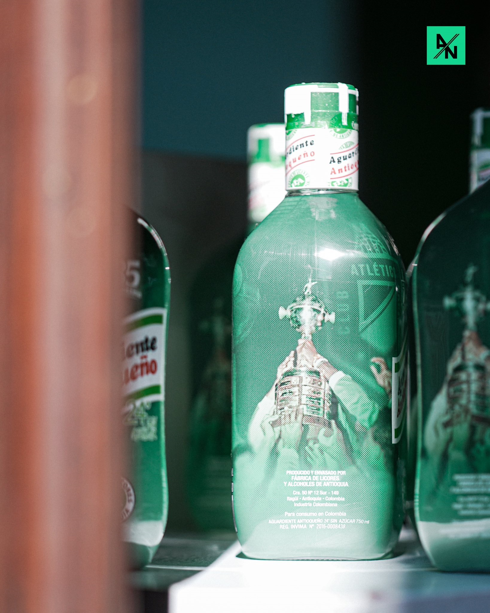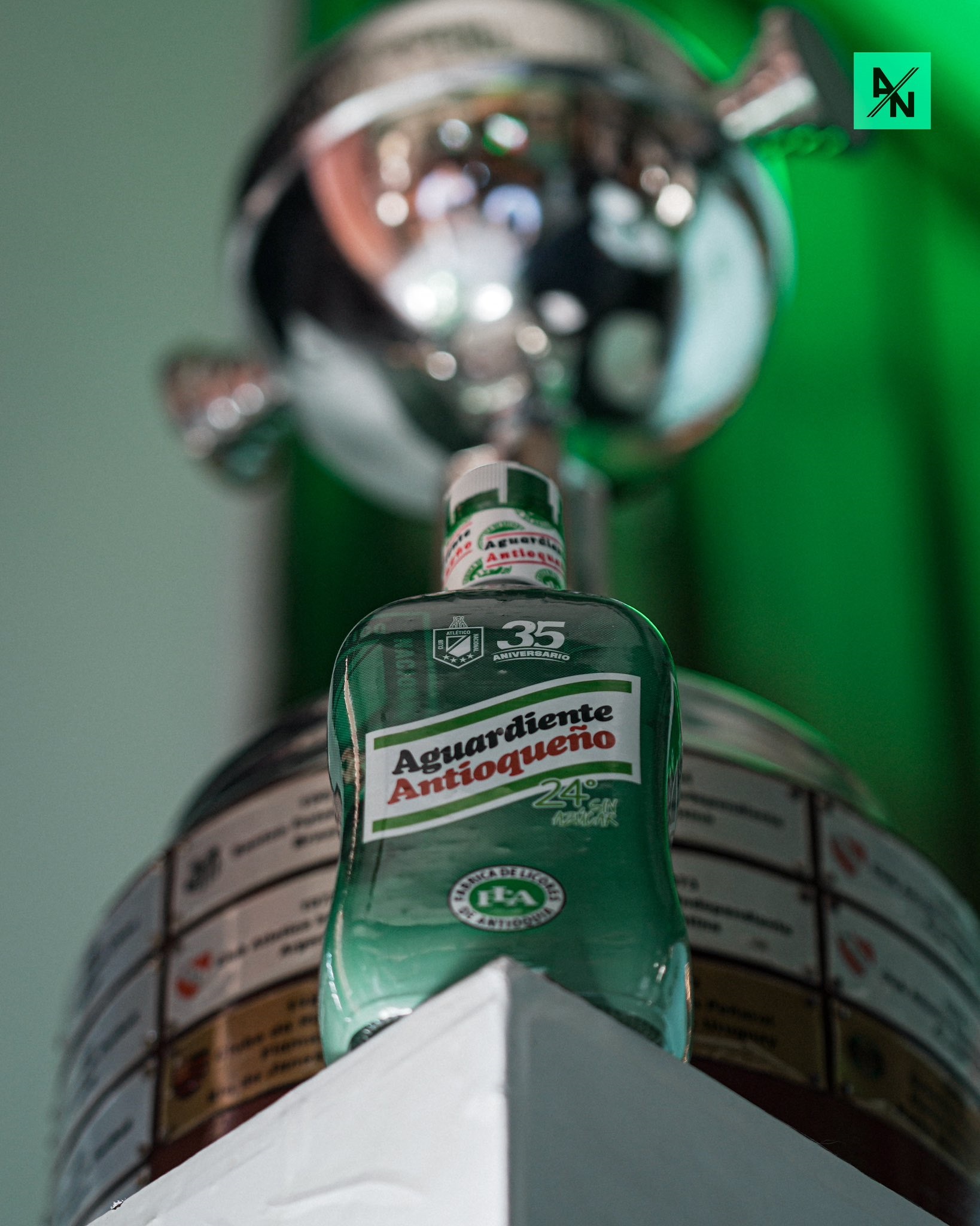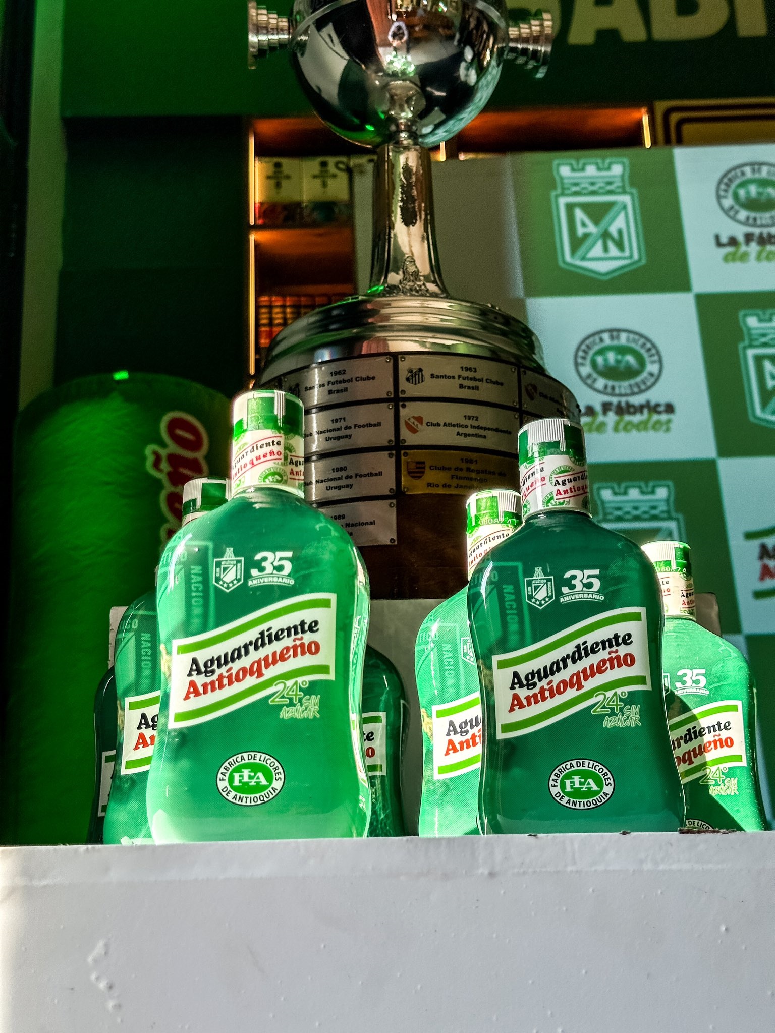 La Fábrica de Licores de Antioquia, FLA y Atlético Nacional lanzaron la botella conmemorativa de los 35 años de la primera Copa Libertadores para el verde paisa.