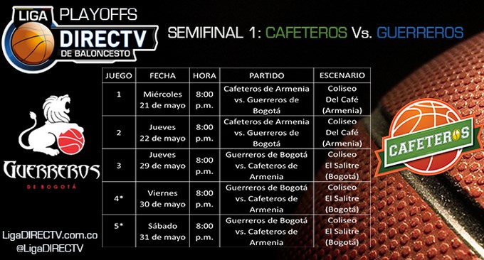Minuto30.com.- Guerreros de Bogotá y Cafeteros de Armenia protagonizarán una de las semifinales de la Liga DIRECTV 2014-1. La serie entre bogotanos y quindianos tendrá inicio este miércoles 21 de marzo, en el Coliseo del Café de la ciudad de Armenia.