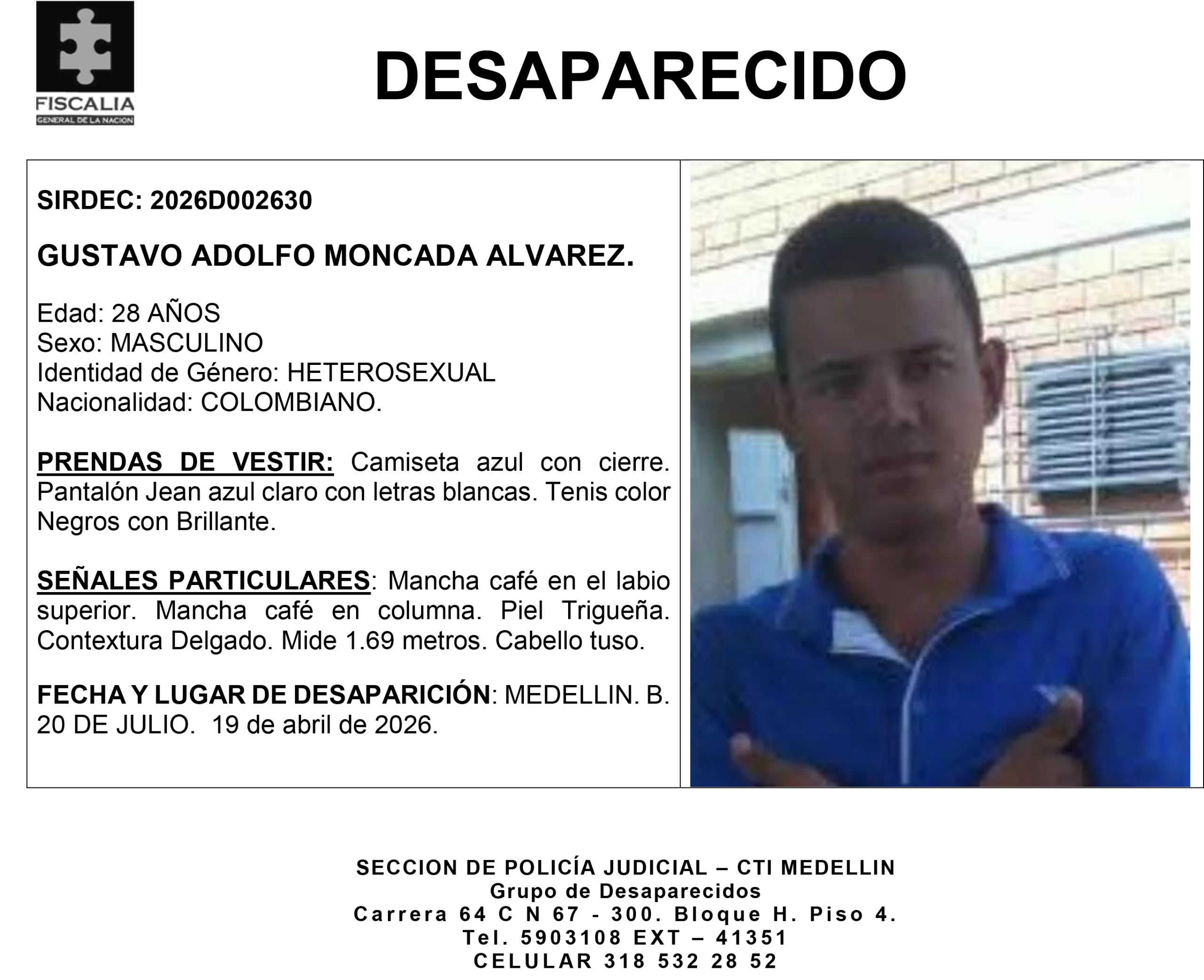 Fue reportado como desaparecido el 19 de abril de 2026 en Medellín, específicamente en el barrio 20 de Julio. Cualquier información que contribuya a su ubicación es relevante para las autoridades y sus familiares.
