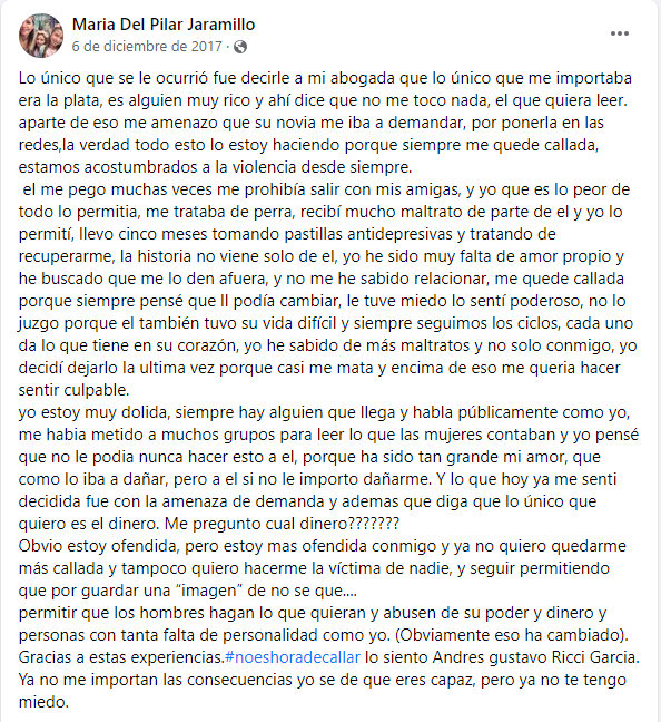 En el Facebook de María del Pilar Jaramillo, exesposa de Ricci García, se encontró una publicación de hace cinco años, donde con dolor, pero mucha valentía cuenta los maltratos que recibió de parte de su esposo e incluso, asegurando ya no tenerle miedo.