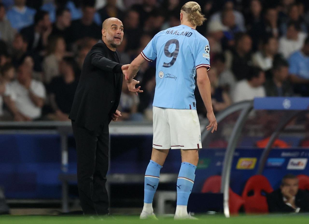 Pep Guardiola (i) y Erling Haaland. EFE/EPA/SEDAT SUNA