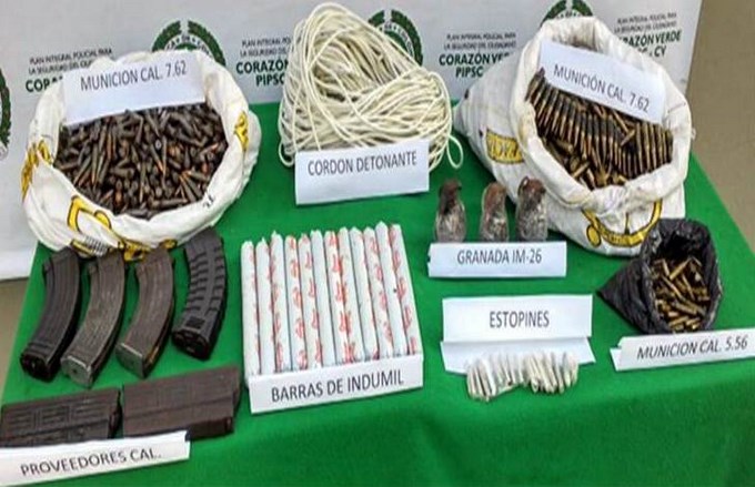 Corazón Verde, en zona rural, vereda Juan Brand del municipio de Remedios, en desarrollo de la Operación República 257, continuando con la política nacional de seguridad ciudadana y estrategias trazadas por la Dirección General de la Policía, en la lucha frontal contra las bandas criminales dedicadas al narcotráfico y Microtráfico, extorsión y el homicidio en la región del nordeste de Antioquia, con el fin golpear la estructura financiera y logística de estos grupos para contrarrestar las acciones delictivas de las bandas criminales; mediante actividades de inteligencia, investigativas e información aportada por fuente humana y judicialización, se logró la ubicación e incautación en zona boscosa, camuflada entre maraña de una bolsas plásticas color negro y baldes plásticos de color azul, la cual al ser inspeccionada se observa en su interior material de guerra, así:
