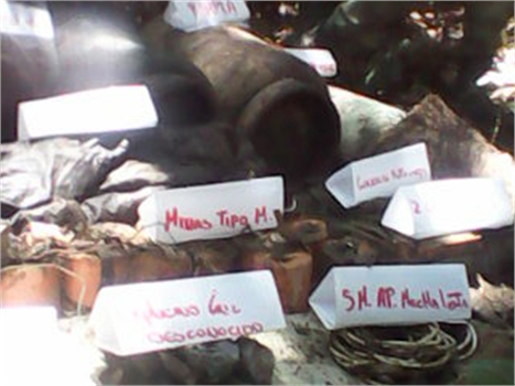 El material encontrado es el siguiente: 2 cilindros de 40 libras; 1 rampa de lanzamiento; 16 artefactos explosivos improvisados con sistemas de activación eléctricos y por presión; 1 cilindro de oxigeno; 1 kilo de explosivo; 5 metros de mecha lenta; 1 pistola calibre 7.65 milímetros y 1 proveedor calibre 7.65 milímetros con 6 cartuchos.