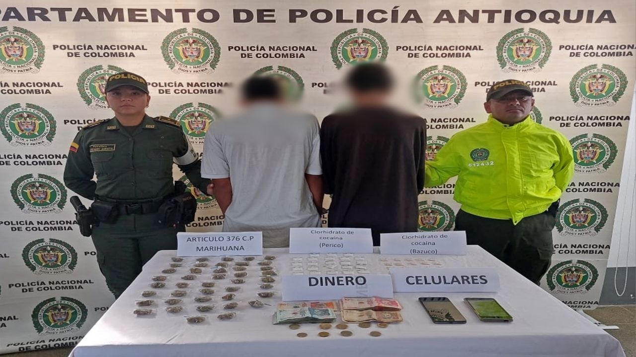 En Vegachí, en zona rural, fueron capturados dos hombres de 20 y 18 años, quienes se les incautó 150 gramos de marihuana, 100 gramos de cocaína y 80 gramos de bazuco.