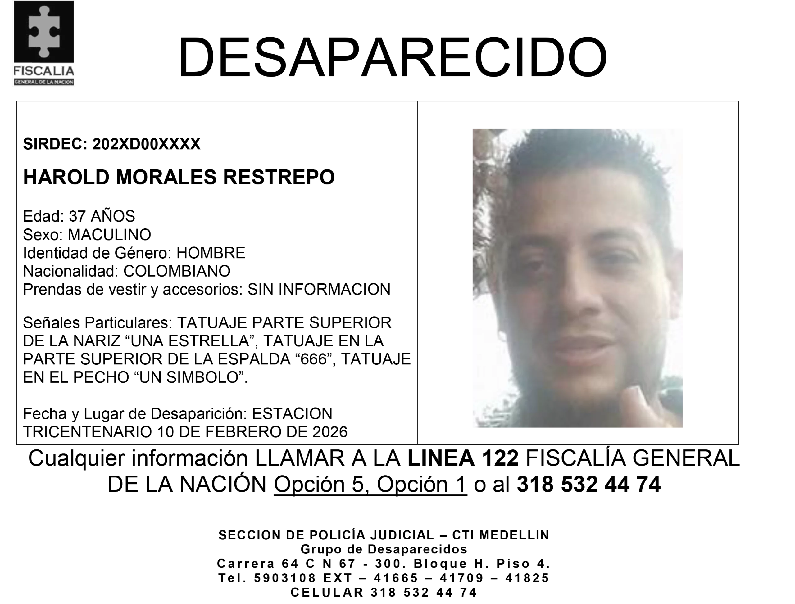 Harold Morales Restrepo es un hombre colombiano de 37 años, de sexo masculino e identidad de género masculina. No se cuenta con información sobre las prendas de vestir o accesorios que llevaba al momento de su desaparición.