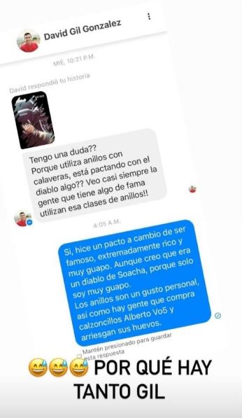 El accesorio que tiene una calavera de imagen causó duda en un seguidor, quien no se aguantó las ganas de preguntarle por qué utilizaba anillos con dicha imagen y si tenía pacto con el diablo, asegurando que muchos famosos usan ese tipo de elementos.