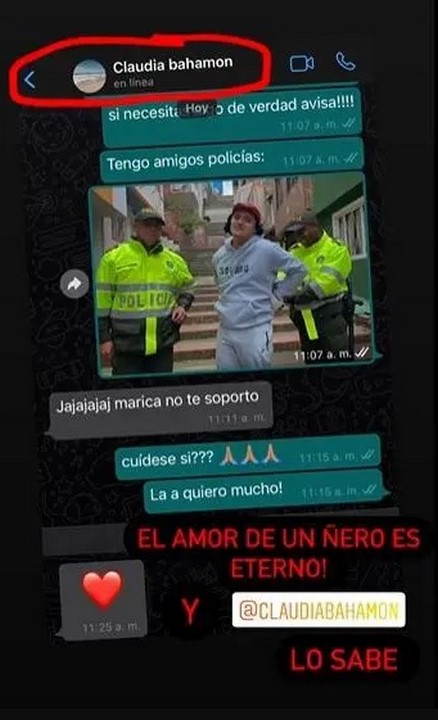 El humorista que además es amigo de Claudia Bahamón, le escribió, “Si necesita apoyo, de verdad avisa. Tengo amigos policías. Cuídese, la quiero mucho”, y al lado una imagen que mostraba Hassam junto a dos policías.
