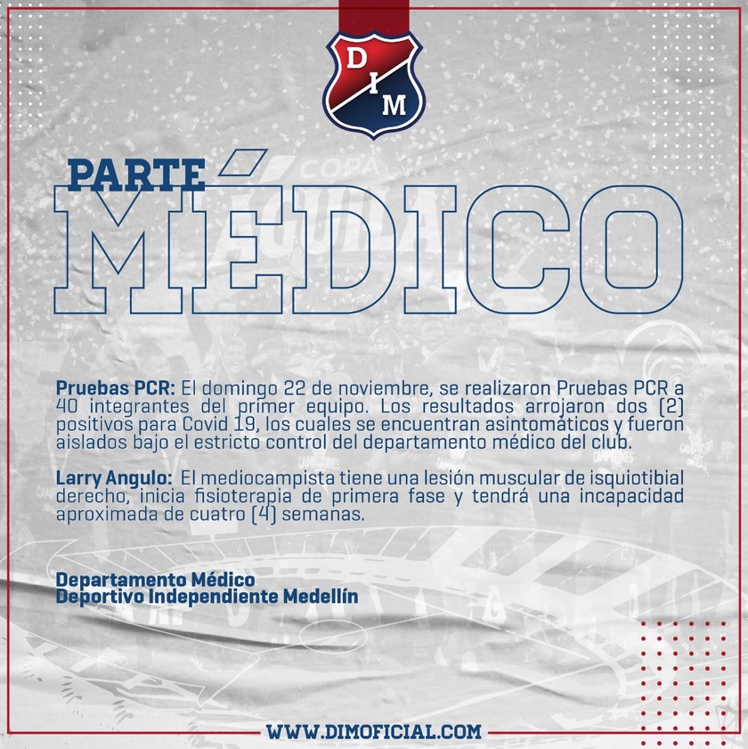 Minuto30.com-   Deportivo Independiente Medellín dio a conocer este lunes un reporte médico en el que confirma dos casos de Covid-19 al interior del club.
