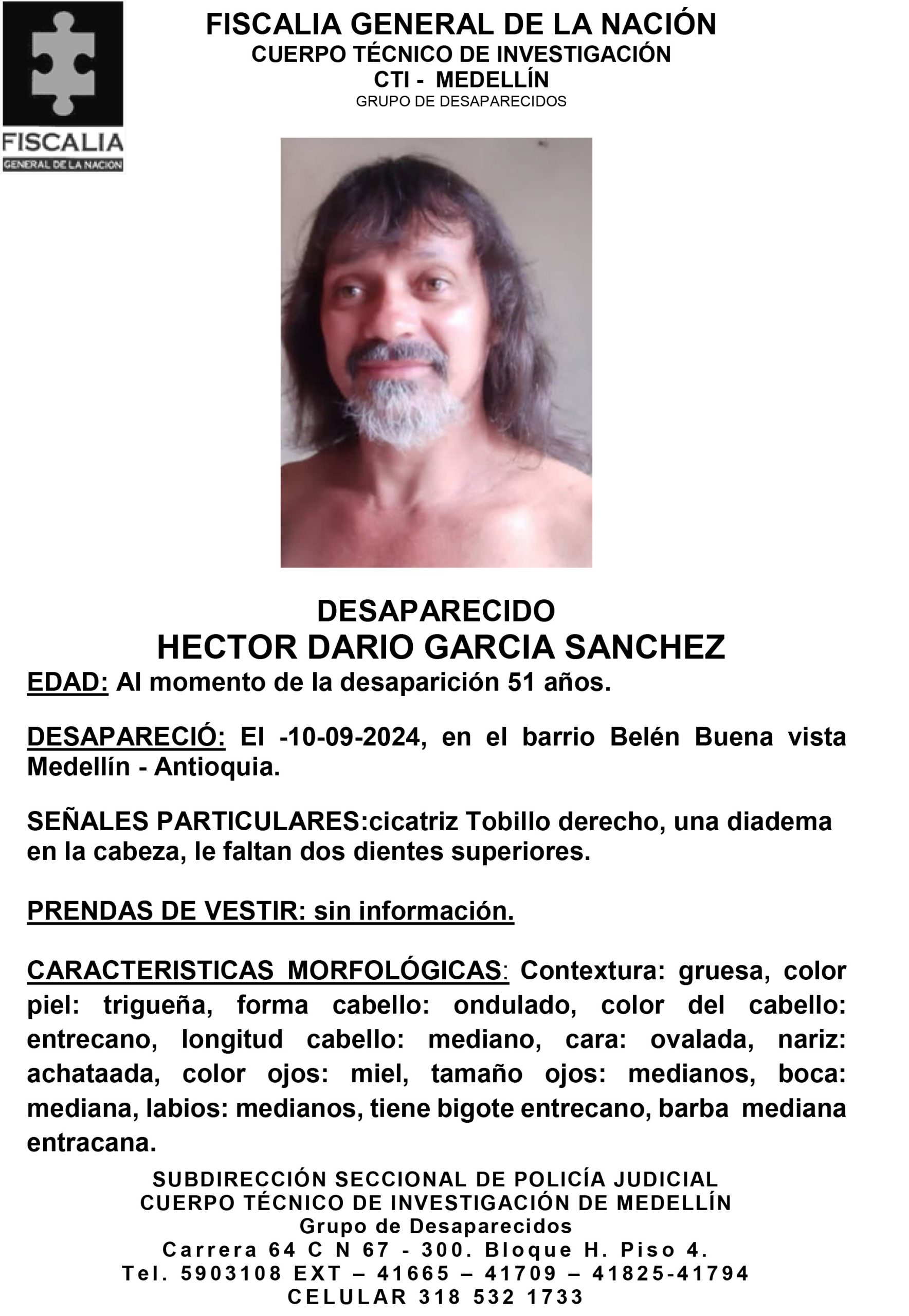 Resumen: Héctor Darío García Sánchez, de 51 años, desapareció el 10 de septiembre de 2024 en el barrio Belén Buena Vista, Medellín, Antioquia.