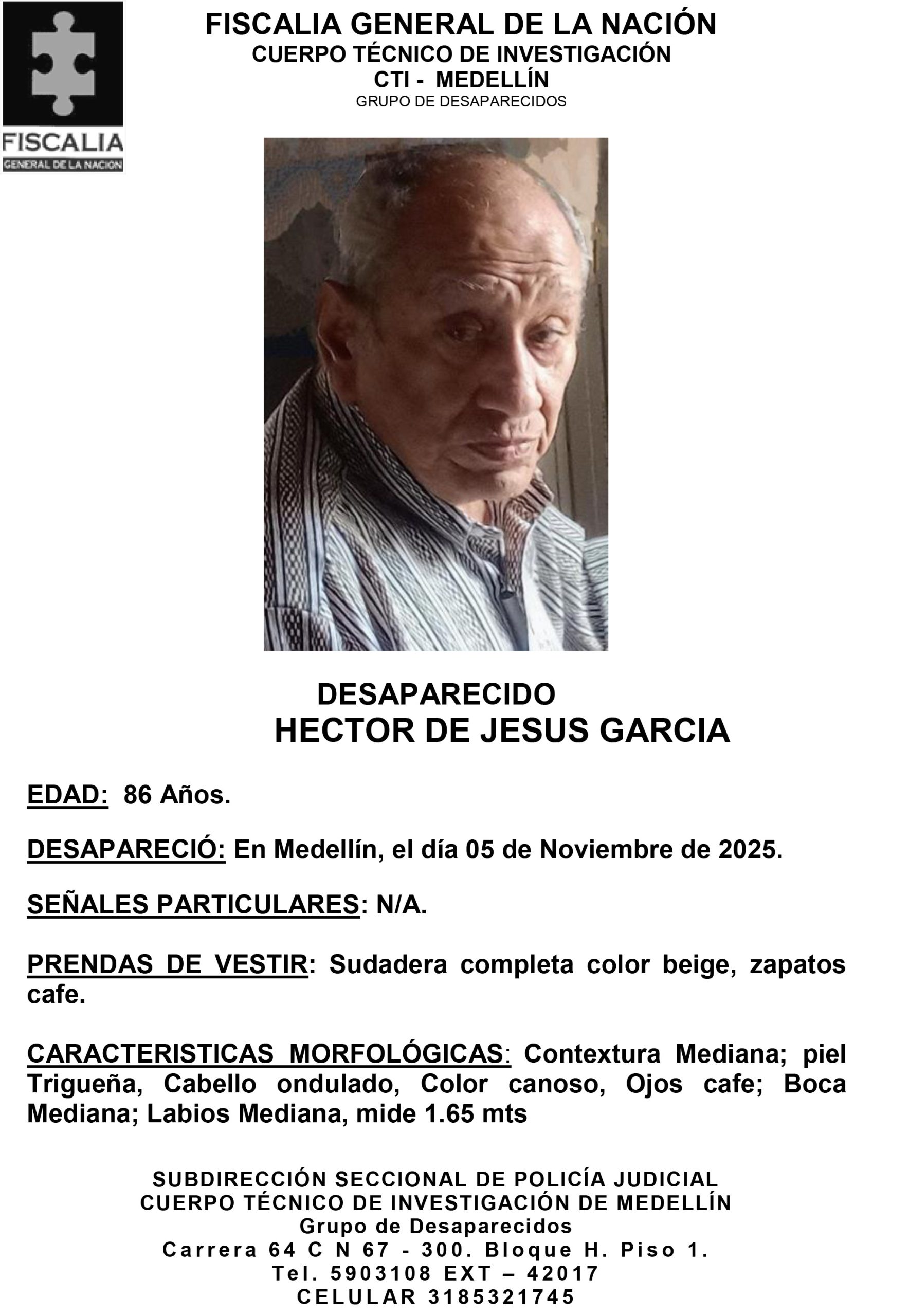 Héctor de Jesús García, de 86 años de edad, fue reportado como desaparecido en la ciudad de Medellín el pasado 5 de noviembre de 2025.