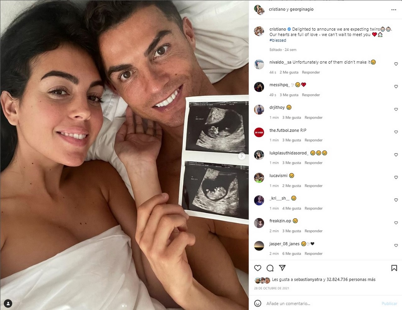 Recordemos que el pasado lunes 18 de abril, Cristiano Ronaldo y Georgina Rodríguez dieron a conocer: «Con nuestra más profunda tristeza tenemos que anunciar el fallecimiento de nuestro hijo. Es el dolor más grande que unos padres pueden sentir», compartieron en sus redes sociales.