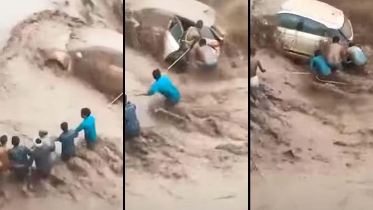 En redes se hizo viral este asombroso video donde se muestra como mientras se sostenían de una cuerda con mucha fuerza, varios hombres hacen todo lo posible por estar en contra de la corriente, y llegar hasta la puerta de ese carro, para salvar a la mujer de ser ahogada.