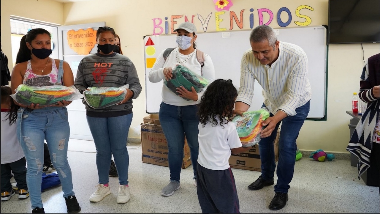 Cada paquete escolar contiene un morral, cuadernos, caja de colores, estuche con lápiz, tajalápiz, bolígrafo y borrador, botella plástica para cargar líquido, una lonchera para llevar su refrigerio y una capa impermeable con capucha que les permita cubrirse ante la lluvia.