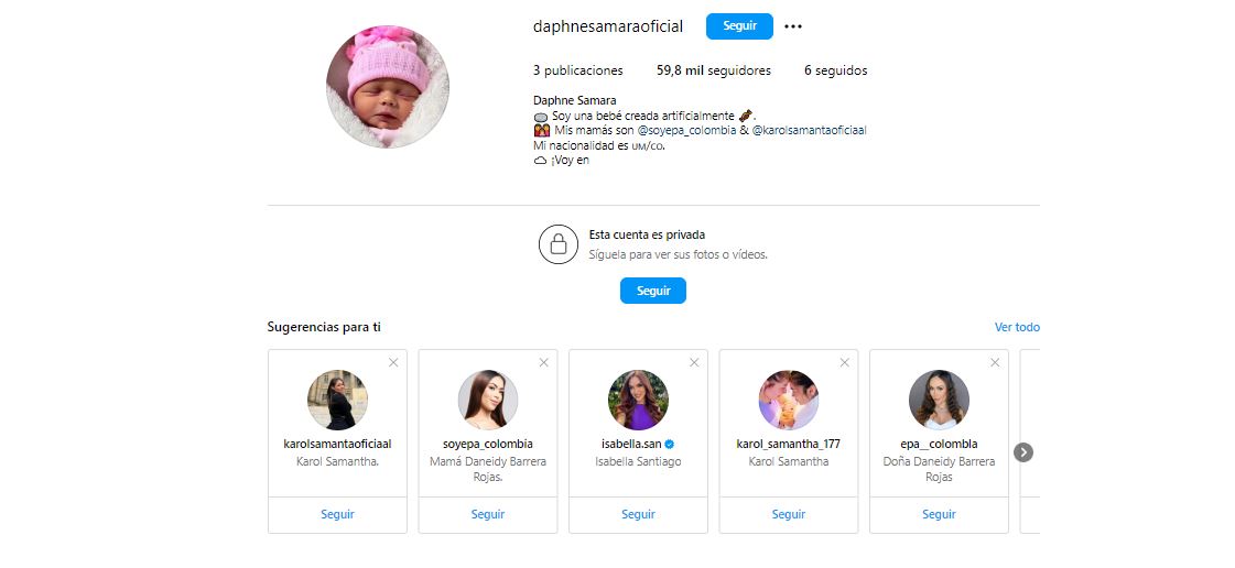 Daphne Samara quien cumplió este 8 de mayo su primer mes, ya es una celebridad en redes como hija de Epa. En instagram tiene una cuenta que no se sabe si fue la influencer la abrió. Porque aún es privada y pueder que fans de Dadeiny se le adelantaron. Una de las cuentas “Epa_Colombia” que aclara que es la de fans con más de 162.000 seguidores comparte videos con su hija, fotos y detalles especiales. Detallando el nacimiento hasta el primes mes. La duda es que Daphne es referenciada como @daphnesamaraoficial. Un cuenta que al darle click es privada con la frase “soy una bebé creada atificialmente“. Esa cuenta tiene 59.8 mil seguidores.