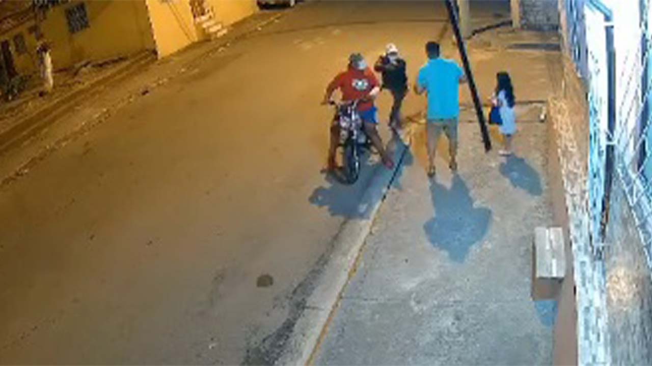 En video de cámara de seguridad quedó el momento en el que llegan dos hombres en una motocicleta, sin importar la presencia de la niña los delincuentes asaltan y atacan a un padre en presencia de su hija pequeña.