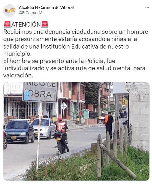 Autoridades de El Carmen de Viboral confirmaron que recibieron una denuncia en la que dicen que presuntamente un hombre estaría acosando a niñas a la salida de una Institución Educativa del municipio.