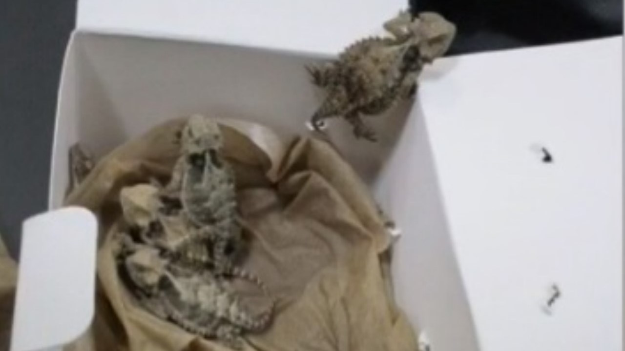 Las autoridades afirmaron que al momento de revisar al sujeto hallaron varias bolsas de plástico que contenían 43 lagartos cornudos (Phrynosoma) -conocidos también como llora sangres- y nueve serpientes.