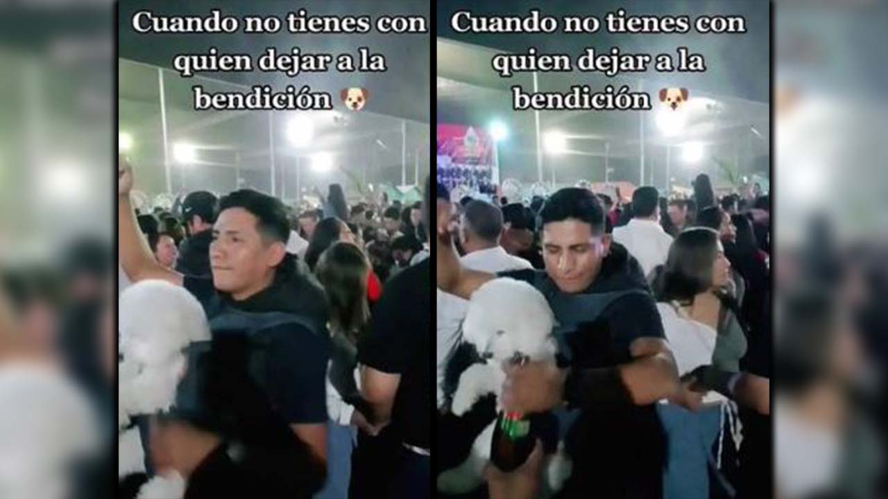El video publicado en la plataforma de TikTok por el usuario @carolinaleoncarde, muestra a un hombre disfrutando entre la multitud de un concierto. Sin embargo, lo que llama la atención es que en una pechera, se encuentra su perrito.