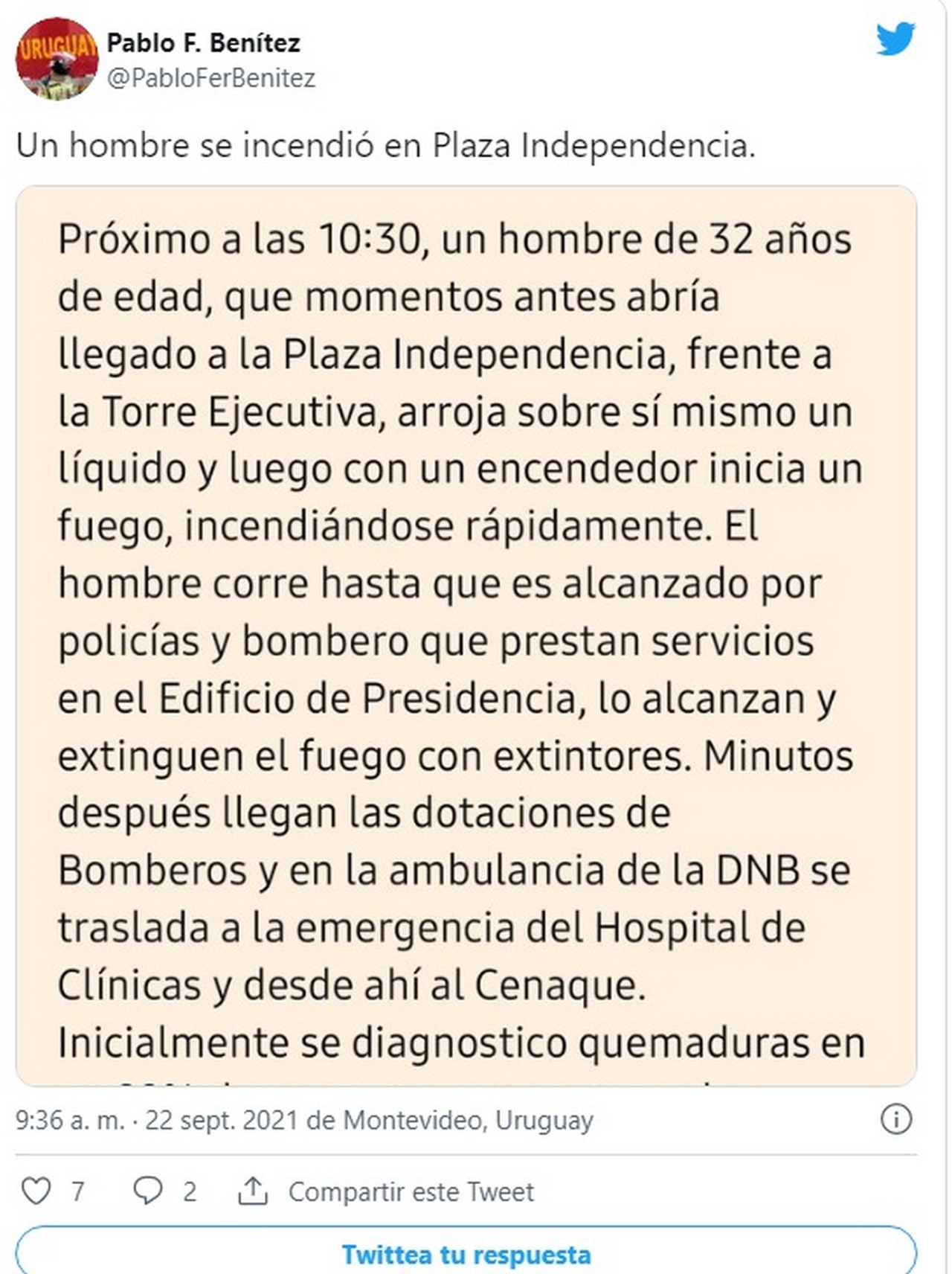 Un hombre de 32 años se roció con combustible y se prendió fuego en la Plaza Independencia de Montevideo, Uruguay, frente a la Torre Ejecutiva, sede del Gobierno de Uruguay.