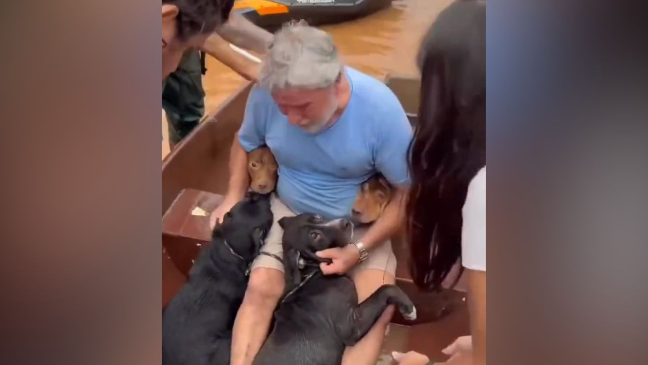 | Un hombre logró rescatar a sus cuatro perros durante las graves inundaciones que azotan Brasil.