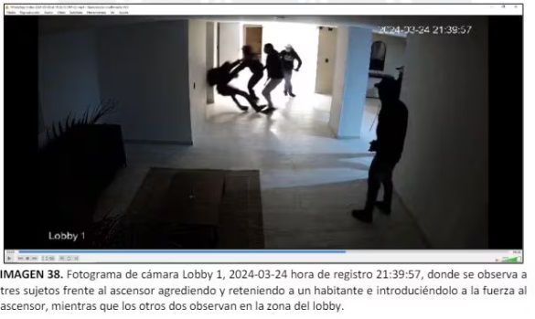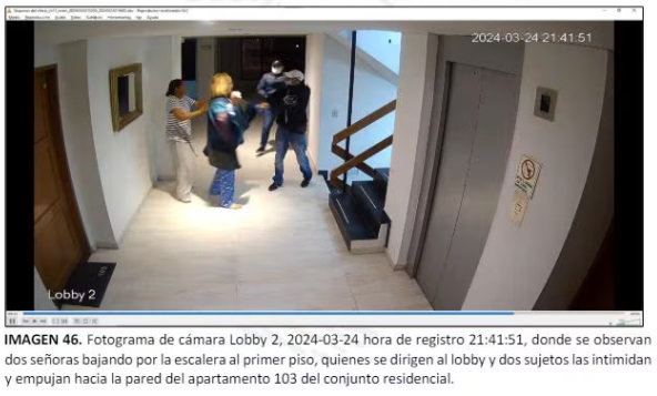 “Se observan dos sujetos; uno de ellos con jean claro, saco oscuro, gorra blanca, tapabocas y tenis oscuros quien amedranta a las habitantes en la zona del lobby con un elemente no identificado; un sujeto de chaqueta azul y gorra negra que lo acompaña; un tercer sujeto con prenda oscura y jean claro, zapatillas blancas, gorra negra y guantes, saliendo del ascensor; un cuarto sujeto con gorra negra, quien se encuentra al interior del ascensor reteniendo a una persona”, dice el reporte de la investigación publicado por Semana.